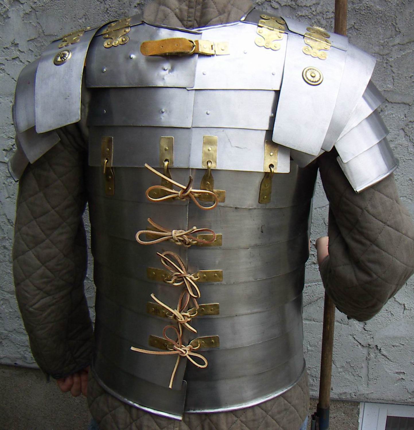 | A Corbridge type B or C cuirass. This was built for a friend who intends to use it for display. It was constructed from light weight stainless steel with forged fittings in brass. Steel and brass was collected primarily from dumpsters around Columbia University. |